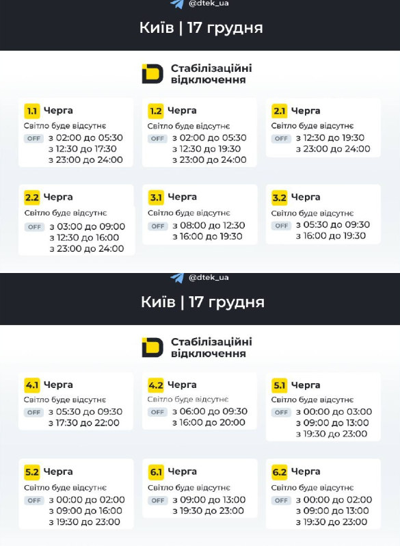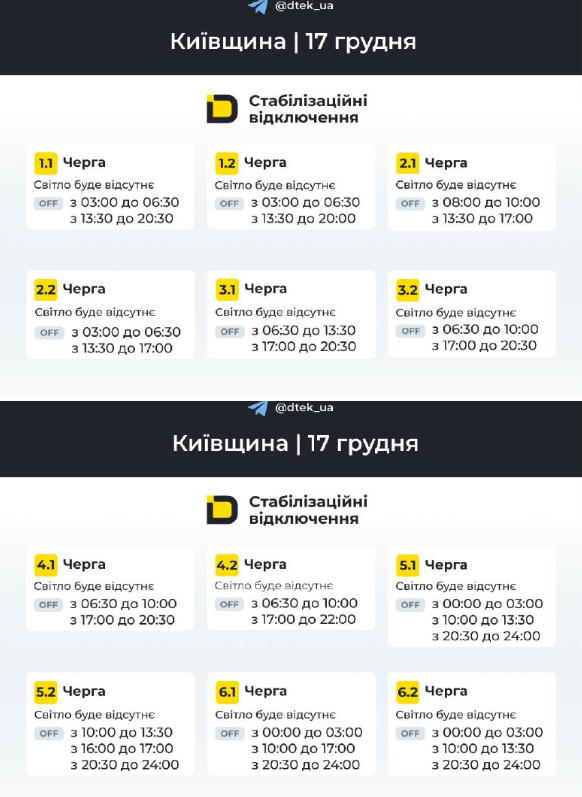 В Украине 17 декабря будут отключать электроэнергию круглосуточно, от двух до четырех раз в сутки. В Днепропетровской области некоторые очереди будут оставаться без света более 14 часов, а в Одесской области из-за аварийной ситуации после российского обстрела графики не действуют.
