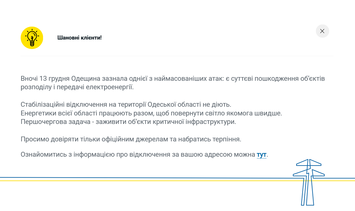 Из-за массированного российского удара по Одесской области в ночь на 13 декабря в регионе получили значительные повреждения объекты распределения и передачи электроэнергии, поэтому стабилизационные отключения здесь пока не действуют. Энергетики в первую очередь работают над запиткой объектов критической инфраструктуры. Информация по конкретному адресу доступна на сайте "ДТЭК Одесские электросети".