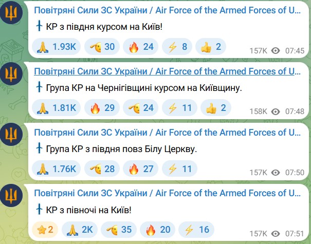 По данным Воздушных сил ВСУ, оккупанты атаковали регион с применением аэробаллистических ракет "Кинжал", крылатых ракет "Калибр", а также ударных беспилотников. Сообщалось о взлете самолета МиГ-31К, а также о движении нескольких скоростных целей в направлении столицы.