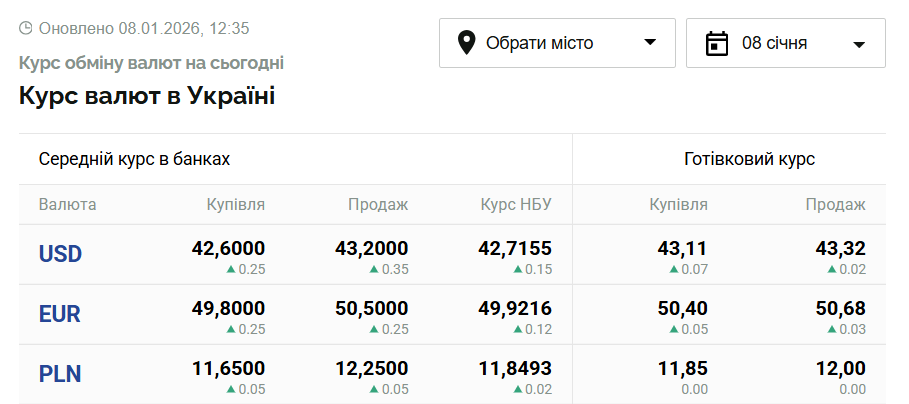 8 января курс доллара в банках и обменниках вырос и превысил отметку в 43 гривны. Также повысилась стоимость евро.