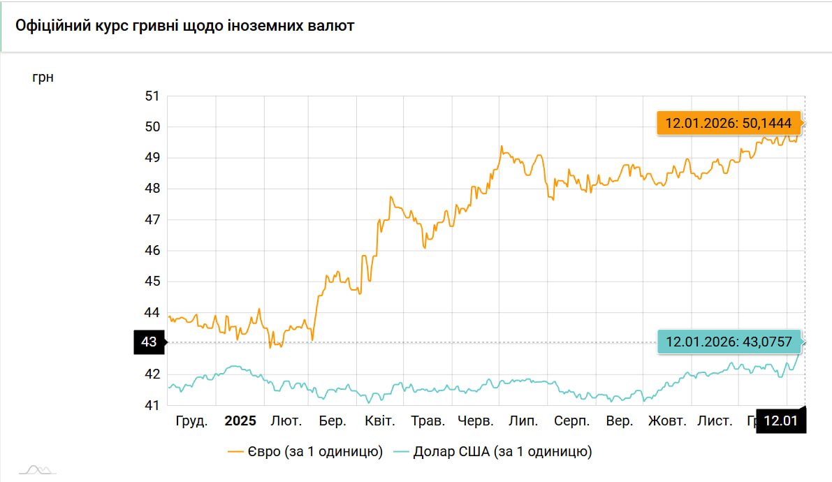 Курс евро на 12 января 2026 года Нацбанк установил на уровне 50,1444 грн — на 3 копейки ниже по сравнению с пятницей. Впрочем, в отличие от доллара, роста евро в начале прошлого года не было.