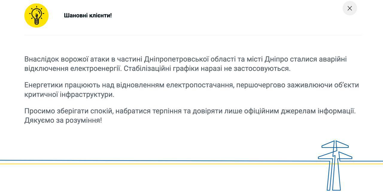ДТЭК | информация об отключении света в Днепре и области 11 января