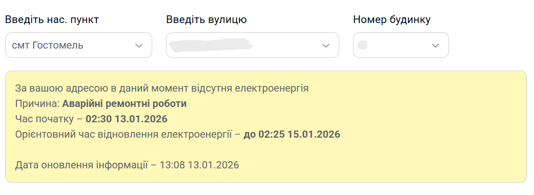 В разделе проверки текущих отключений по адресам в Буче сообщается об отсутствии электроэнергии. Аварийные ремонтные работы, которые начались в 2:30 13 января, продлятся ориентировочно до 02:25 15 января.