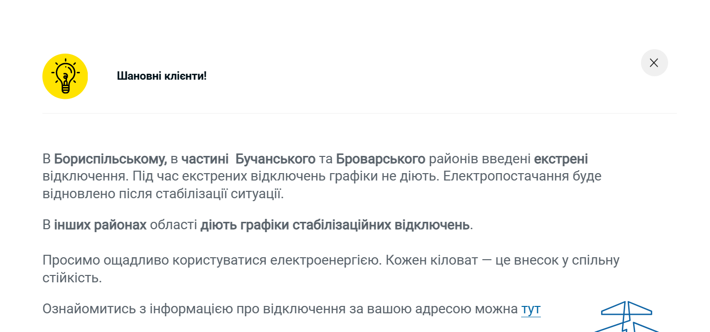Объявление об экстренных отключениях света в Киевской области размещено на сайте "ДТЭК Киевские региональные электросети". Графики не действуют в Бориспольском, Бучанском и Броварском районах.