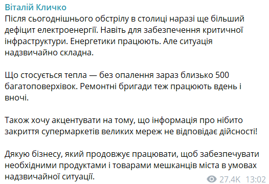 Ее не хватает даже для обеспечения критической инфраструктуры, написал мэр Киева Виталий Кличко.