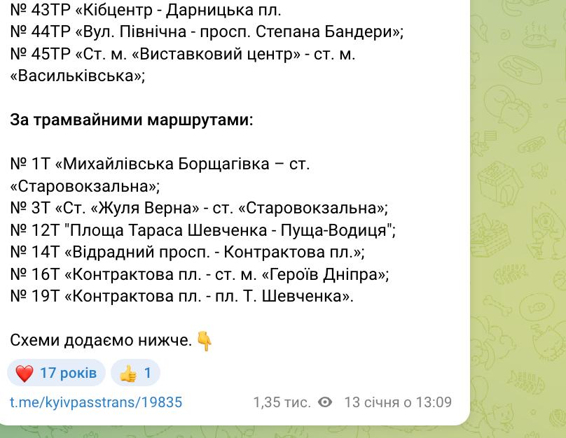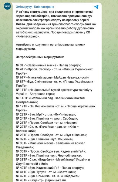 В связи с ухудшением ситуации с электричеством в столице "Киевпастранс" временно приостановил движение наземного электротранспорта на правом берегу Киева. Для сохранения транспортного сообщения на отдельных направлениях организована работа дублирующих автобусных маршрутов.