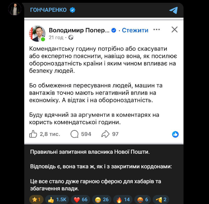 Позже на это сообщение на своей странице в Telegram отреагировал народный депутат от партии "Европейская солидарность" Алексей Гончаренко. Политик поддержал поставленные вопросы и заявил, что ситуация с комендантским часом, по его мнению, напоминает историю с закрытыми границами. По его словам, такие ограничения со временем превратились в удобный инструмент для злоупотреблений и коррупционного обогащения представителей власти.