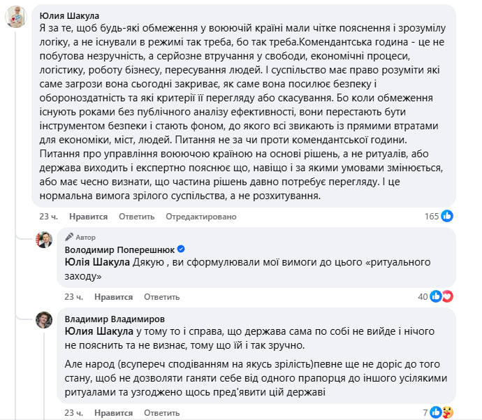 Активное обсуждение продолжилось и в комментариях. Наибольшее количество реакций вызвало сообщение одной из пользовательниц Facebook, которая отметила, что в условиях войны любые ограничения должны иметь понятное объяснение и логику. Она подчеркнула, что комендантский час — это не просто бытовое неудобство, а серьезное вмешательство в свободы граждан, работу бизнеса, логистические процессы и передвижения людей.