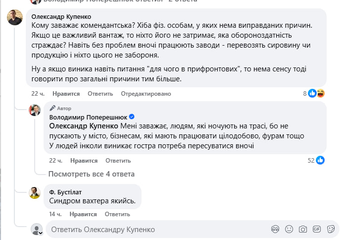 "Мне мешает, людям, которые ночуют на трассе, потому что не пускают в город, бизнесам, которые должны работать круглосуточно, фурам и тому подобное. У людей иногда возникает острая необходимость передвигаться ночью", — написал Владимир Поперешнюк в ответ на комментарий.