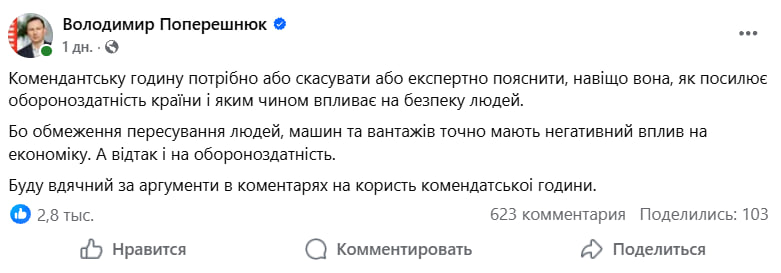 Толчком к обсуждению стало сообщение совладельца компании "Новая Почта" Владимира Поперешнюка, обнародованное в Facebook. В частности, в своем посте, бизнесмен заявил, что комендантский час стоит или отменить, или же четко и аргументированно объяснить его необходимость. По его словам, государство должно публично разъяснить, каким именно образом это ограничение повышает безопасность людей и усиливает обороноспособность страны.