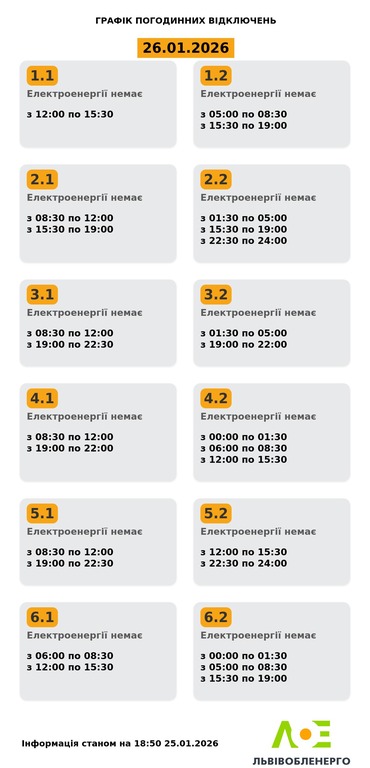 В Львовской области местные энергетики обнародовали новые графики отключения света на 26 января. Сейчас прогнозируется, что продолжительность пребывания без света для бытовых потребителей составит от 3,5 до 8,5 часов в зависимости от очереди.