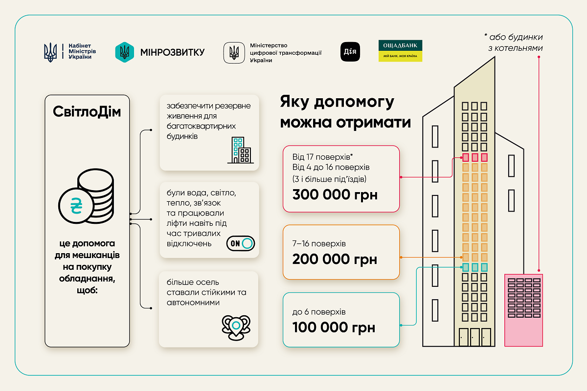 Программа "СвітлоДім" — это первый общегосударственный проект, направленный именно на поддержку жителей многоквартирных домов. Она должна помочь обеспечить автономную работу ключевых систем жизнеобеспечения в случае аварийных или плановых отключений электроэнергии.