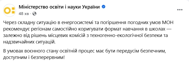 "Рекомендации предоставлены с учетом решения Кабинета Министров Украины от 15 января 2026 года № 39, а также действующих рекомендаций МОН по организации образовательного процесса в условиях возможных масштабных обесточиваний", — сказано в сообщении.
