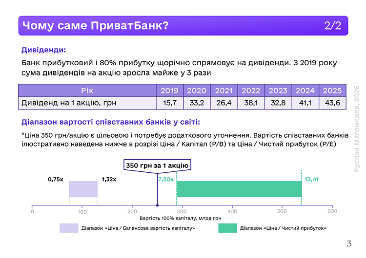 В презентации подчеркивается инвестиционная привлекательность "ПриватБанка". В среднем каждая акция генерирует около 40 грн дивидендов в год, что соответствует доходности около 10%. В 2025 году ожидаемая дивидендная доходность — 12,4%.