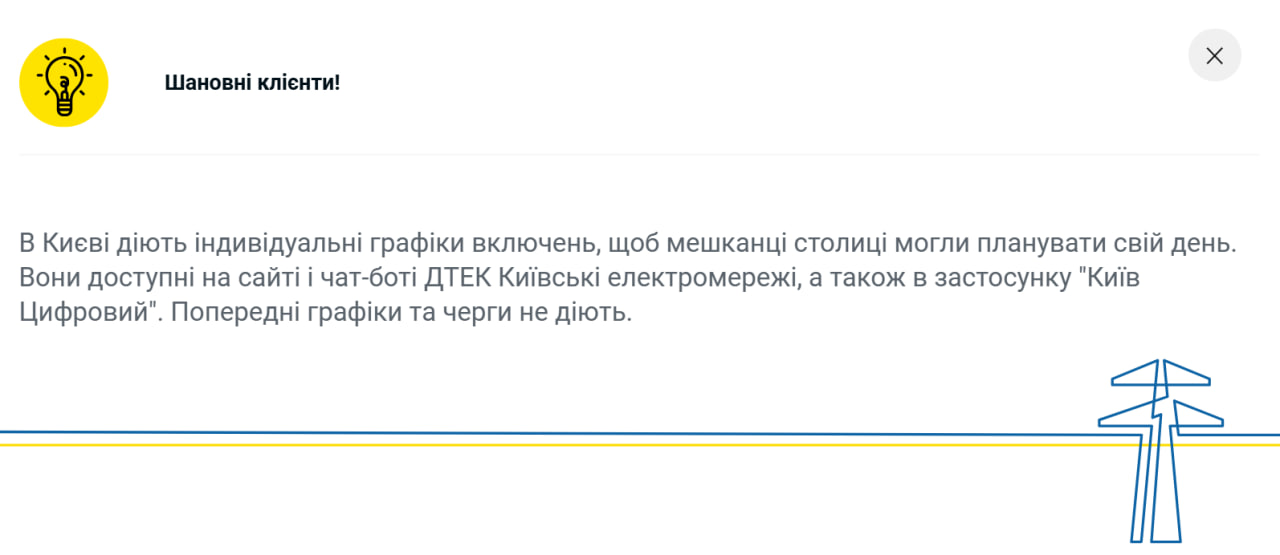 Сейчас на сайте ДТЭК также отмечают, что в столице начали действовать индивидуальные графики включений света, чтобы местные могли планировать свой день. Киевляне могут посмотреть когда по их адресу не будет света на сайте и чат-боте, а также в приложении "Киев Цифровой". Кроме того, в ДТЭК отметили, что предыдущие графики и очереди не действуют.