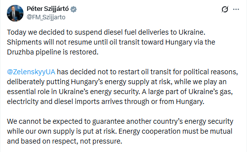 "Зеленский принял решение не возобновлять транзит нефти по политическим причинам, намеренно ставя под угрозу энергоснабжение Венгрии, в то время как мы играем важную роль в энергетической безопасности Украины", — говорится в сообщении.