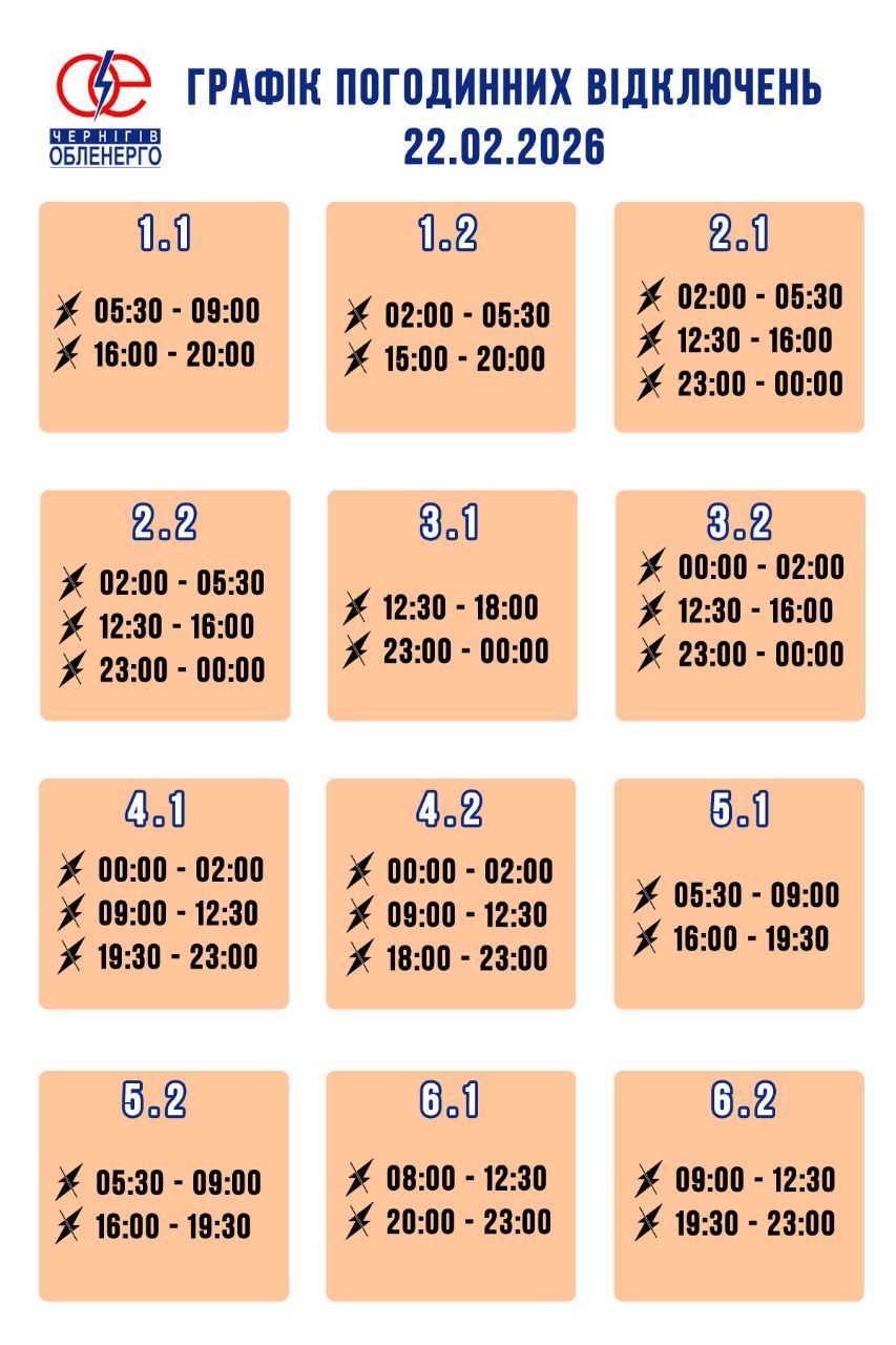 По информации АО "Черниговоблэнерго", 22 февраля в регионе введен график почасовых отключений по распоряжению НЭК "Укрэнерго". Электроэнергию будут выключать для всех групп потребителей несколько раз в течение суток — ориентировочно от двух до трех раз. В случае изменения ситуации возможна корректировка графиков.