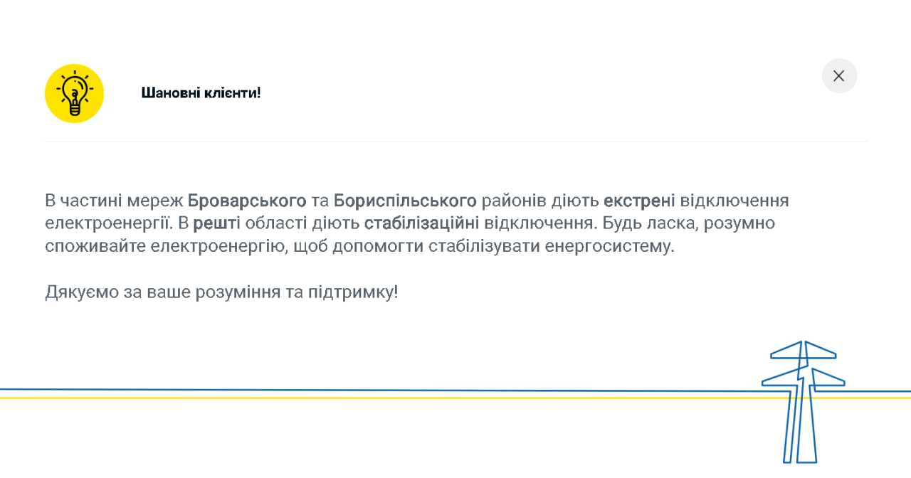 В ДТЭК проинформировали, что в результате вражеских атак часть потребителей в Хаджибейском и Киевском районах Одессы временно осталась без электроснабжения. В областном центре и отдельных населенных пунктах региона введены экстренные обесточивания, которые происходят вне плановых графиков. Зато в Броварском и Бориспольском районах Киевской области частично применены аварийные отключения. Однако в других громадах области действуют стабилизационные графики.