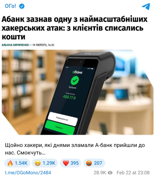 К сообщению соучредитель "Монобанка" также прикрепил скриншот новости о масштабной атаке на "А-банк".