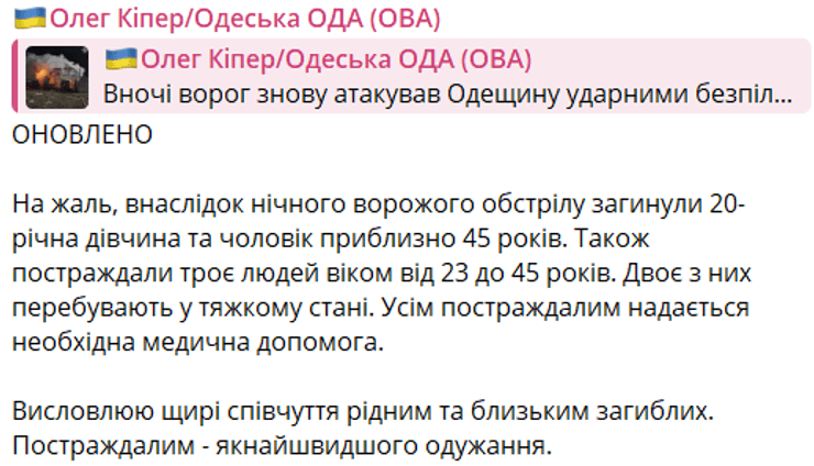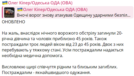 В результате ночной атаки на Одессу и область погибли два человека. Жертвами обстрела стали 20-летняя девушка и мужчина в возрасте примерно 45 лет. Также пострадали еще три человека в возрасте от 23 до 45 лет. Состояние двух из них медики оценивают как тяжелое. Врачи делают все возможное, чтобы спасти их.