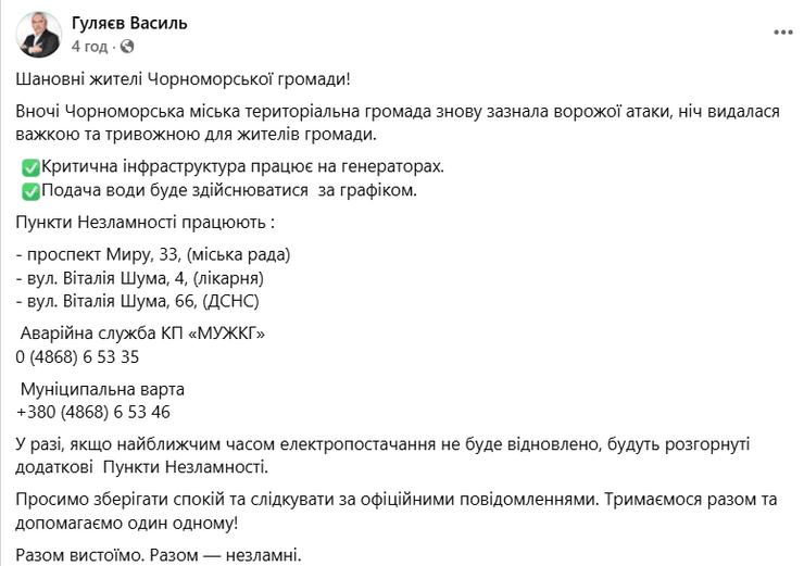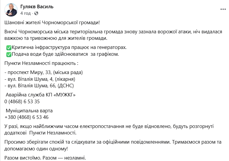 "В случае, если в ближайшее время электроснабжение не будет восстановлено, будут развернуты дополнительные пункти незламності. Просим сохранять спокойствие и следить за официальными сообщениями. Держимся вместе и помогаем друг другу! Вместе выстоим", — говорится в публикации.