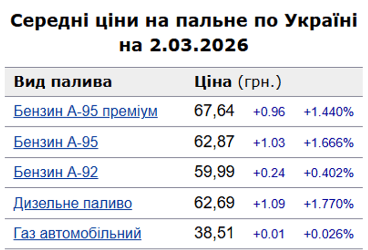 По данным сайта "Минфин", по состоянию на 2 марта дизтопливо и 95-й бензин подорожали в среднем на гривну.