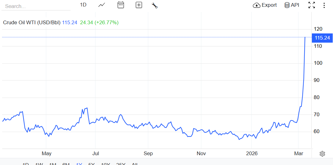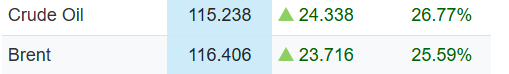 Американский эталонный показатель West Texas Intermediate также преодолел отметку в $115, поднявшись более чем на 26,64% с пятницы.