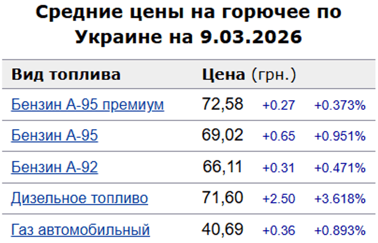 По состоянию на 9 марта цены на заправках не показали существенного роста, кроме дизеля. Он подорожал в среднем на 2,5 грн, и сейчас литр стоит 71,6 грн.
