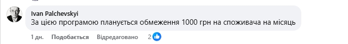 "По этой программе планируется ограничение 1000 грн на потребителя в месяц", — написал в ответ Иван Пальчевский.