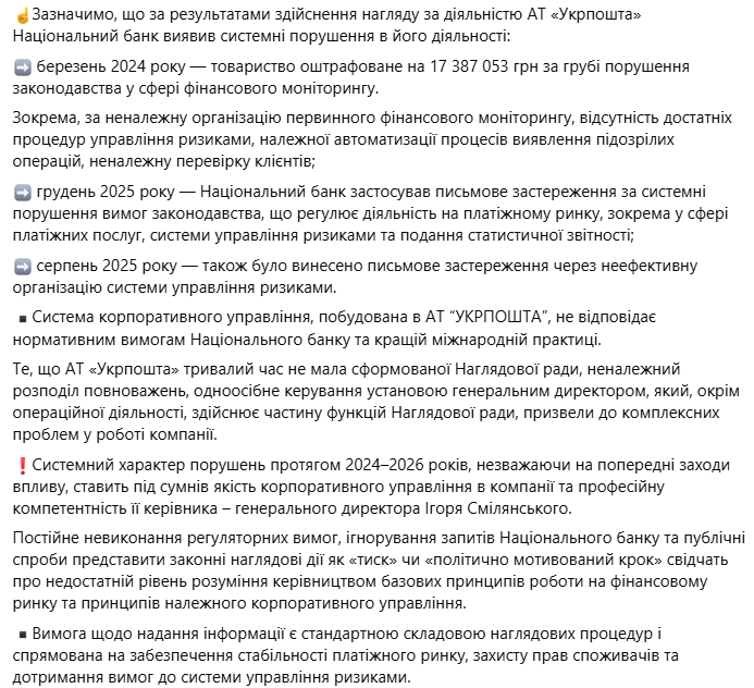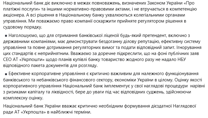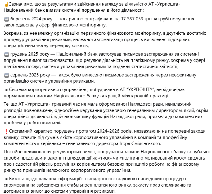 Два дня назад Национальный банк Украины как регулятор опубликовал в соцсетях заявление об отсутствии в АО "Укрпошта" надлежащих систем корпоративного управления, внутреннего контроля и управления рисками.