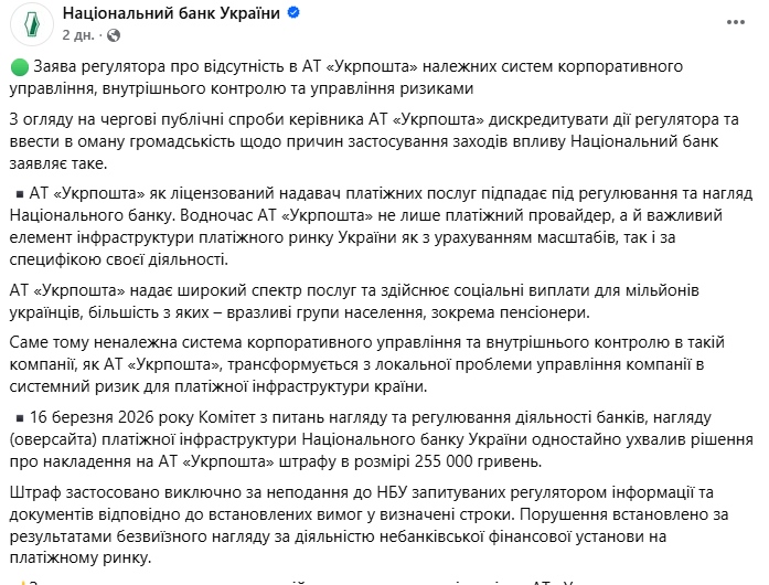 16 марта 2026 года Комитет по вопросам надзора и регулирования деятельности банков, надзора (оверсайта) платежной инфраструктуры НБУ единогласно принял решение оштрафовать почтового оператора на 255 000 гривен. В Нацбанке подчеркнули, что штраф применен "исключительно за неподачу в НБУ запрашиваемых регулятором информации и документов в соответствии с установленными требованиями в установленные сроки".