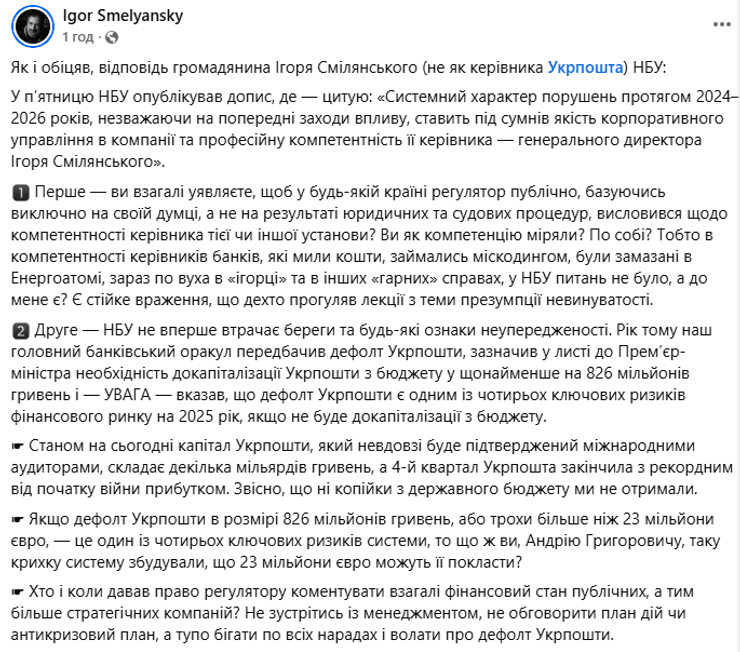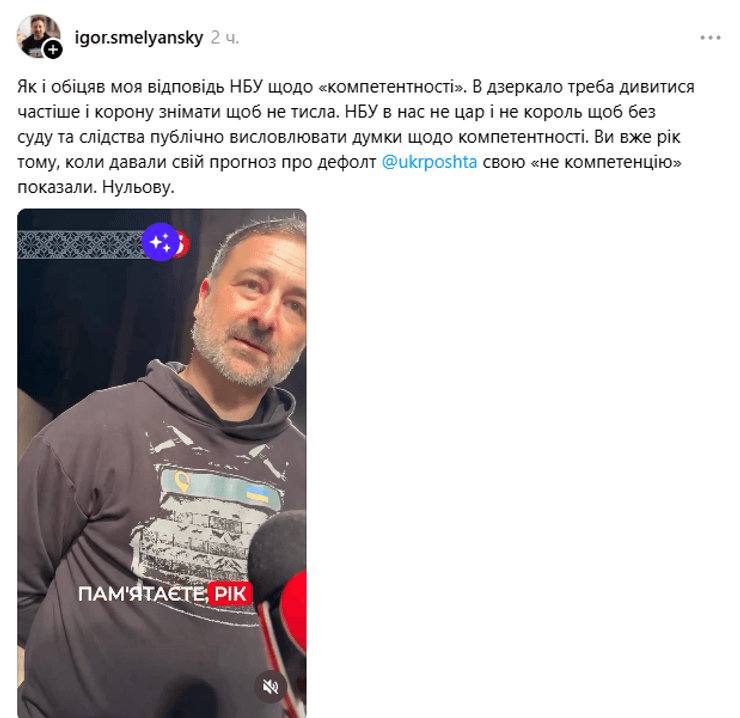 "Как и обещал — мой ответ НБУ о "компетентности". В зеркало надо смотреть чаще и корону снимать, чтоб не давило. НБУ у нас не царь и не король, чтобы без суда и следствия публично высказывать мнения относительно компетентности. Вы уже год назад, когда давали свой прогноз о дефолте "Укрпошта", свою "не компетенцию" показали. Нулевую".
