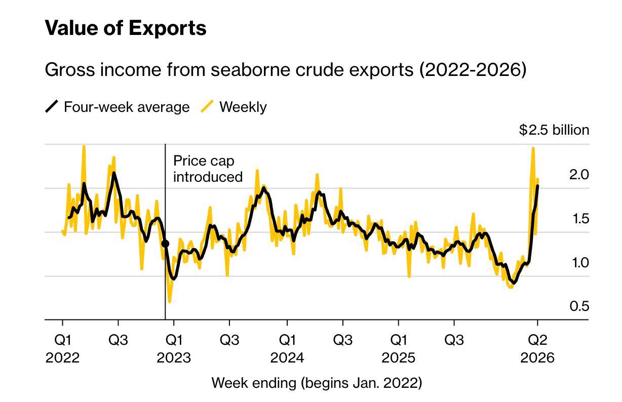 Из-за войны на Ближнем Востоке, повлекшей резкий рост цен на энергоносители в мире, Россия увеличила объемы поставок своей нефти и зарабатывает до 2,02 миллиарда долларов в неделю. Об этом сообщило агентство Bloomberg.