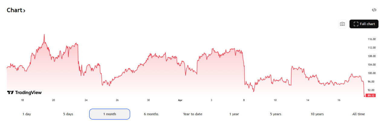 В частности, впервые за месяц цены опустились ниже 90 долларов за баррель. Об этом говорится на сайте TradingView.