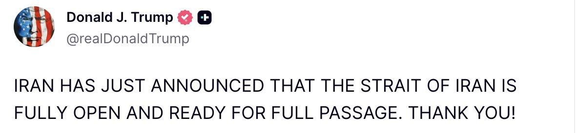 "Иран только что объявил, что Иранский пролив полностью открыт и готов к полному проходу. Спасибо!" — заявил Трамп.