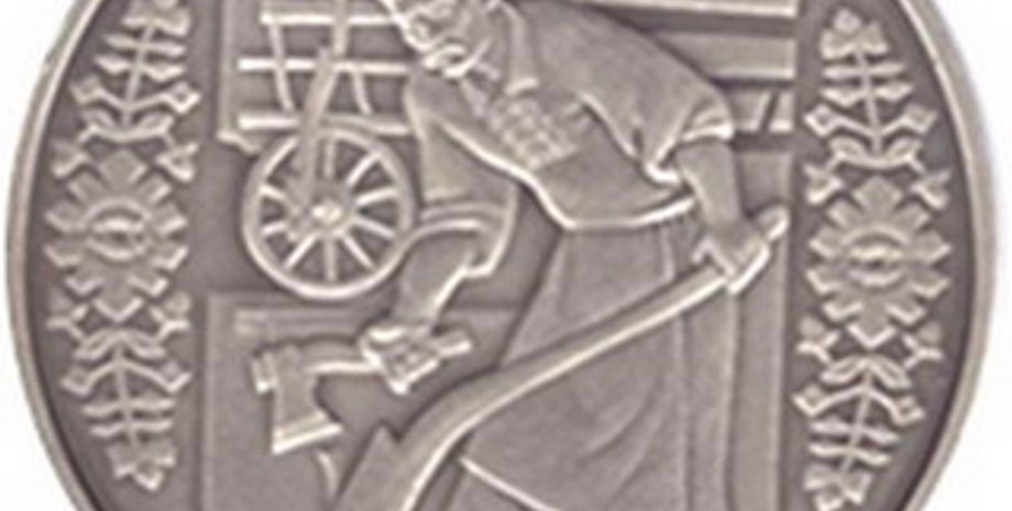 На реверсе монет изображен человек, вытесывающий из дерева деталь телеги.