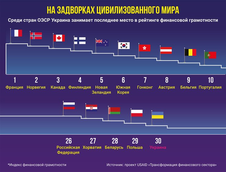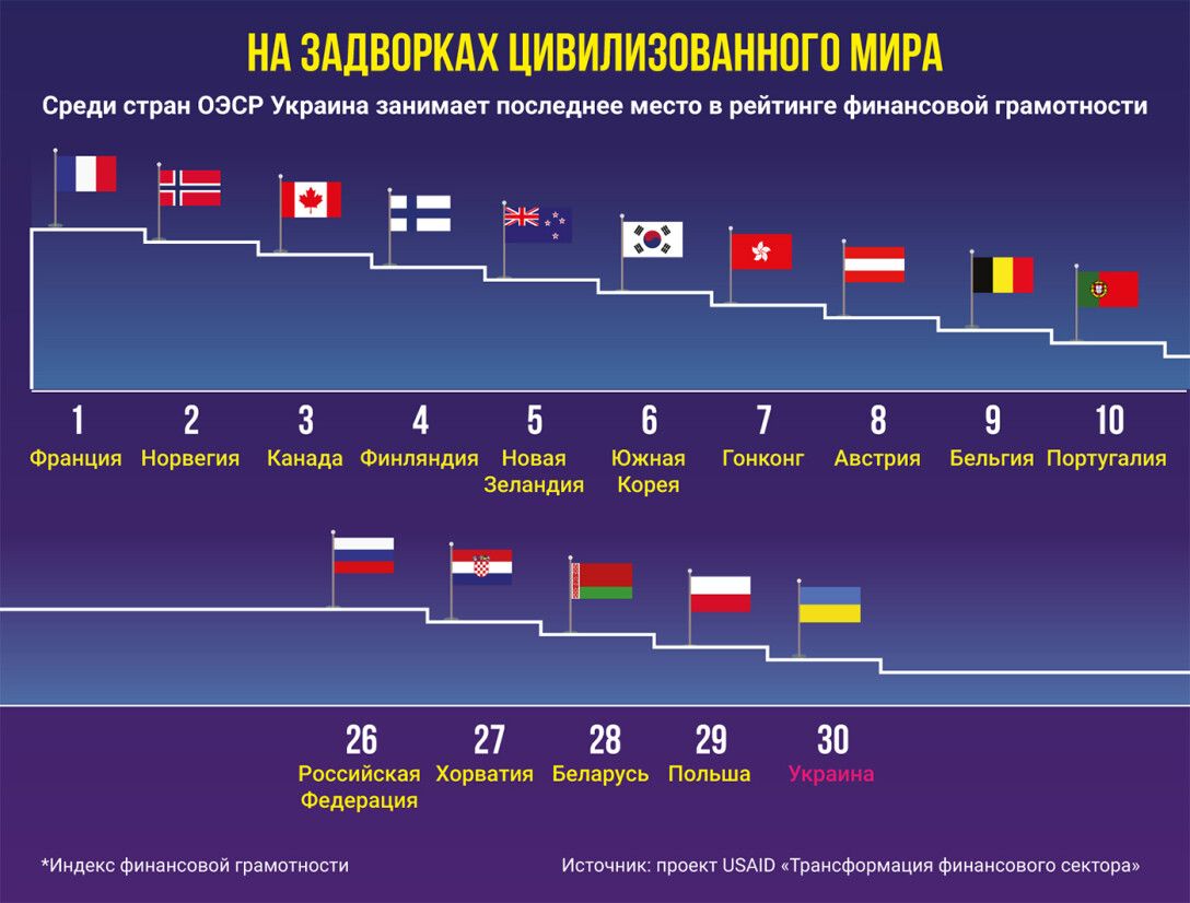 Успехи "великих комбинаторов" в Украине во многом объясняются отсутствием у людей базовых экономических знаний. В рейтинге финансовой грамотности стран Организации экономического сотрудничества и развития (ОЭСР), который в текущем году обнародовал проект USAID "Трансформация финансового сектора", Украина разделила последнее, тридцатое, место с Польшей.