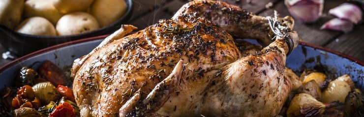 Потом обжарьте курицу со всех сторон на растительном масле, пока кожица не зарумянится и положите ее на противень. На той же сковороде притомите крупно нарезанные овощи: сельдерей, морковь и обычный лук. Обложите ими тушку курицы на противне, присыпьте тимьяном и запекайте в духовке при температуре 180 градусов около часа. Курица будет готова, когда из ее мясистых частей вроде бедра будет выделяться при прокалывании только прозрачный сок.