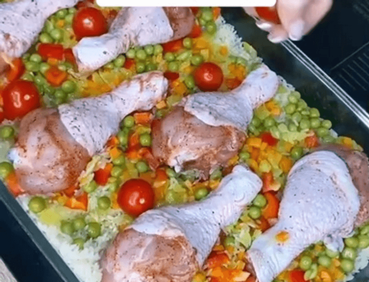 Форму для запекания смазываем растительным маслом. Укладываем рис, затем зажарку из моркови и лука, добавляем нарезанный кубиками перец, зеленый горошек. Сверху выкладываем курицу, помидорки "Черри". Добавляем четыре стакана воды. Предварительно в воду добавляем соль и заливаем.