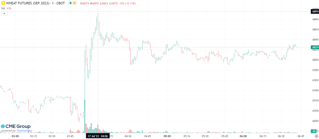 Фьючерсы на пшеницу с поставкой в сентябре подорожали до 6,89 долларов за бушель (на 4,24%) после выхода Москвы из черноморской инициативы, свидетельствуют данные торгов Чикагской товарной биржи.