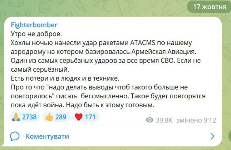 Российский пилот, автор Telegram-канала Helicopterpilot тоже сообщил об ударе ракетами ATACMS. ВСУ якобы получили эти ракеты несколько месяцев назад, утверждает пропагандист.