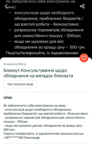 На ОLХ предлагают бесплатно объяснить, какое оборудование понадобится на случай перебоев электричества, если в результате атак ВС РФ зимой пострадает критическая инфраструктура Украины. За 200 грн обещают рассчитать параметры оборудования для самостоятельного поиска. А за 500 грн — специалисты найдут все необходимое оборудование для заказчика по лучшей цене.