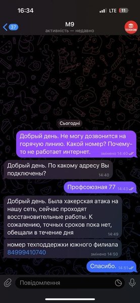 После кибератаки москвичи писали оператору М9ком письма с вопросом, почему не работает интернет и как долго будут восстанавливать проблему. Компания ответила, что точных сроков завершения решения проблемы никто дать не может.