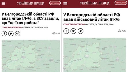 Ранее издание "Украинская правда" со ссылкой на свои источники, сообщило, что Ил-76 якобы уничтожили усилиями Вооруженных сил Украины. Инсайдеры журналистов в Генштабе ВСУ проинформировали, что самолет перевозил ракеты к комплексам С-300, которыми россияне обстреливают Харьковскую область, сообщали журналисты. Публикация появилась в Telagram-канале издания, а также на сайте с заголовком: "В Белгородской области РФ упал самолет Ил-76": в ВСУ заявили, что "это их работа", однако позже из заголовка публикации убрали вторую часть о заявлении военных.