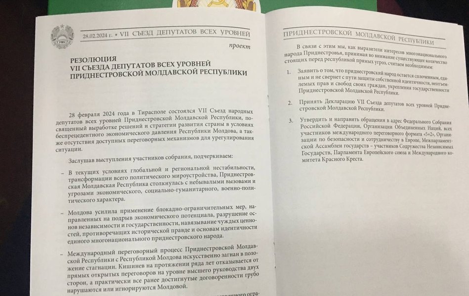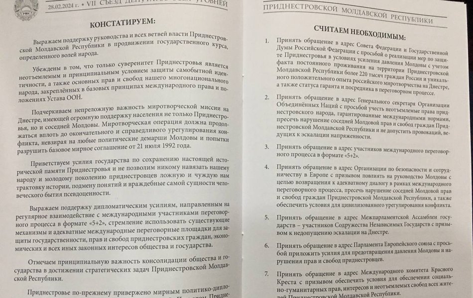 Депутаты подчеркивают, что в "Приднестровской Молдавской Республике" ("ПМР") постоянно проживают более 220 тысяч граждан России. Cъезд просит ООН, СНГ и другие международные организации не допускать эскалации в отношениях Кишинева и Тирасполя.