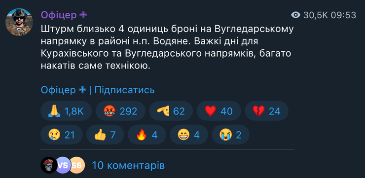 "Штурм около 4 единиц брони на Угледарском направлении в районе н.п. Водяное. Тяжелые дни для Кураховского и Угледарского направлений, много накатов именно техникой", — сказал "Алекс".