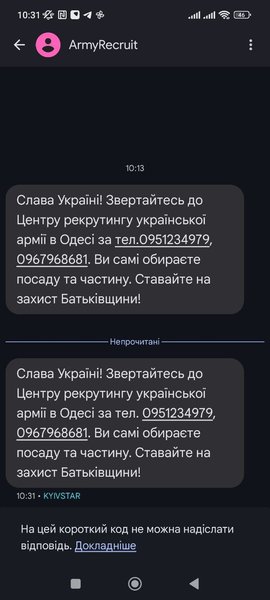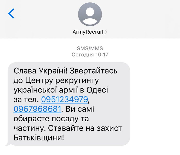 "Слава Украине! Обращайтесь в Центр рекрутинга украинской армии в Одессе по тел.: 0951234979, 0967968681. Вы сами выбираете должность и часть. Становитесь на защиту Родины", — говорится в сообщении.
