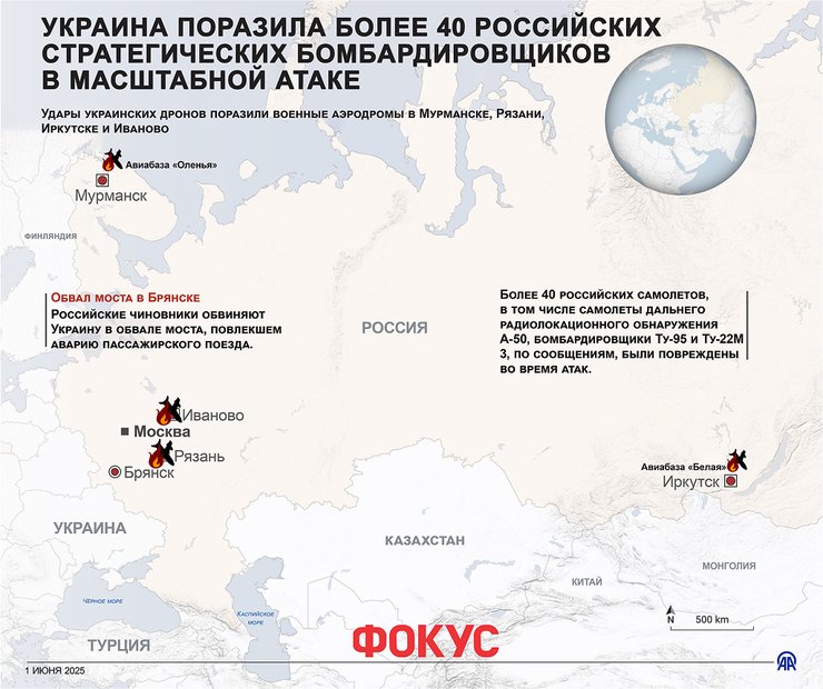 Председатель Службы безопасности Украины Василий Малюк объявил о результатах масштабной спецоперации "Паутина". По его словам, в результате этой операции был поражен 41 самолет стратегической авиации России, среди которых — А-50, Ту-95, Ту-22М3 и Ту-160. Это составляет примерно 34% стратегических носителей крылатых ракет на основных аэродромах базирования РФ. Ориентировочная стоимость уничтоженной авиации превышает 7 миллиардов долларов.