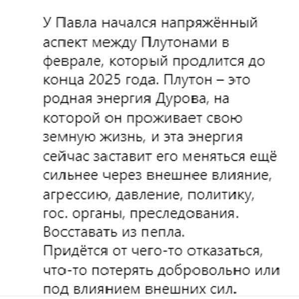 "Плутон — это родная энергия Дурова, на которой он проживает свою земную жизнь, и эта энергия сейчас заставит его меняться еще сильнее через внешнее влияние, агрессию, давление, политику, госорганы, преследования. Восставать из пепла", — пишет она.