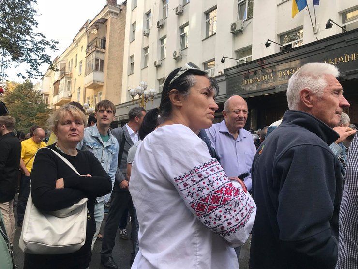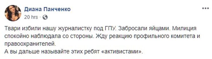 Во время акции праворадикальных сил под стенами Генпрокуратуры пострадала журналистка столичного телеканала NEWSONE. Дарина Билера включалась в прямом эфире, когда в нее прилетели яйца. Журналистка ушла из "зоны обстрела", но тогда к ней подошла одна из участниц акции и дала оплеуху.
